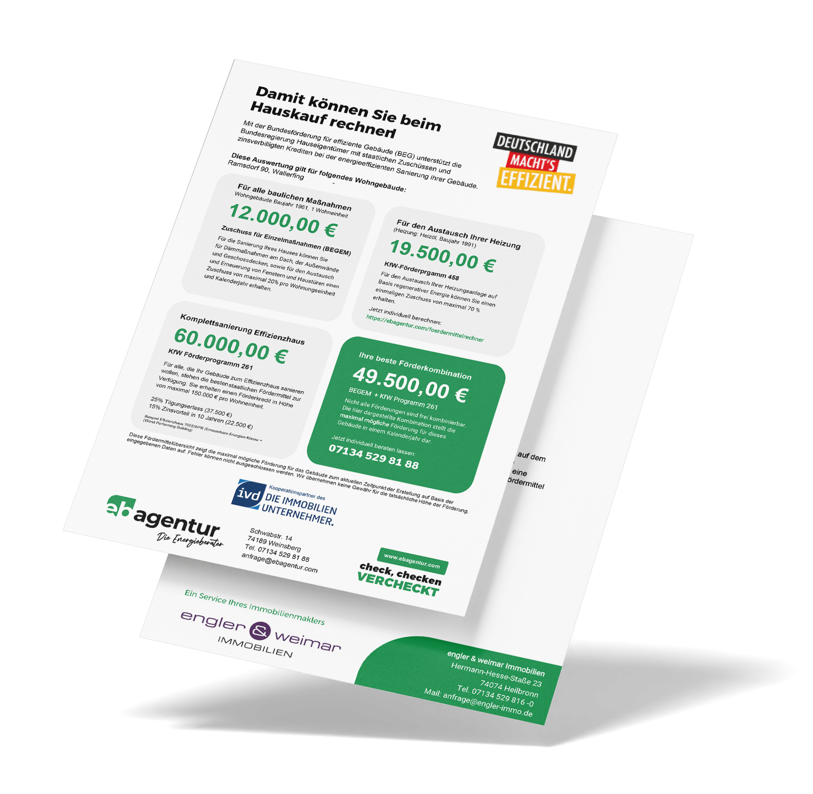 Der EB Fördercheck ist ein kostenloses, online verfügbares Tool, das Ihren Kunden hilft, die besten Fördermöglichkeiten für energetische Sanierungsprojekte zu erhalten. Mit einem persönlichen Shortcode, den Sie als Makler bereitstellen, können Ihre Kunden schnell und unkompliziert die berechneten Fördermittel erhalten.